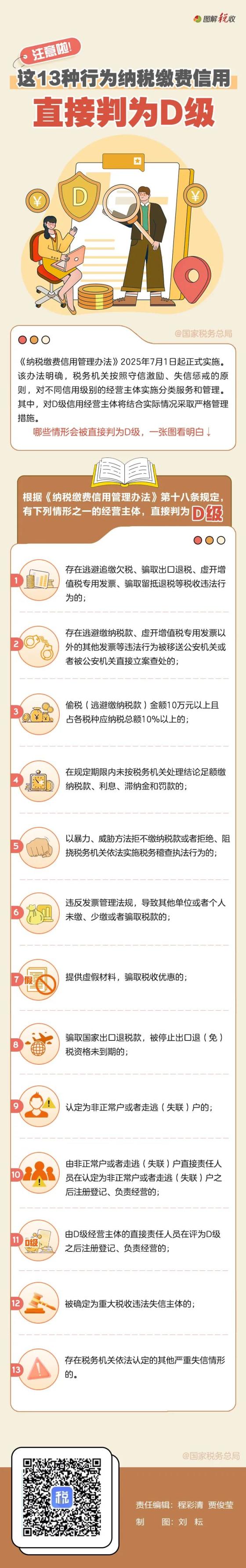 为了圭表征税缴费信用措置,促进征税东说念主缴费东说念主诚信自律,提升税法折服度,鞭策社会信用体系修复,国度税务总局发布《征税缴费信用措置目标》。哪些情形会被平直判为D级?一张图带你看明显↓