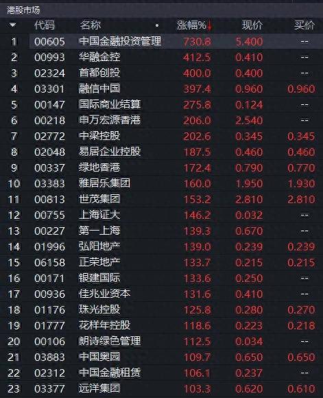 适度昨日收盘,香港恒生指数收涨6.2%,恒生科技指数涨8.53%。内房股(内资房地产股)和中资券商股全线爆发,中国金融投资解决大涨730.8%,申万宏源香港涨206%,融信中国涨397.4%。据潮新闻记者不十足统计,香港主板和香港创业板26只港股涨幅卓绝100%。